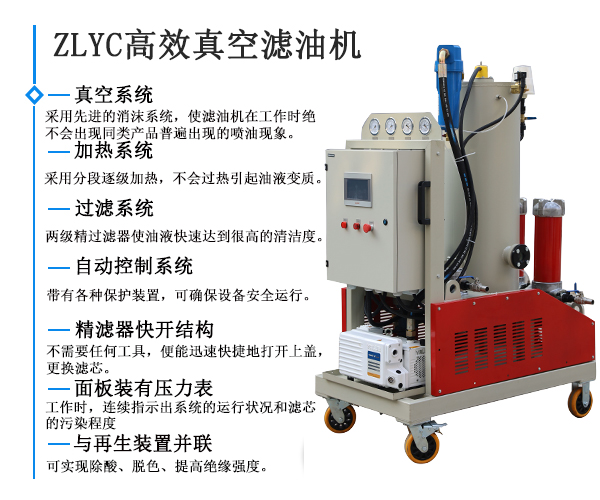 ZLYC-200高效真空濾油機可綜合除去油液中的游離水和部分溶解水及氣體、顆粒等污染物,濾油機適用于各種油品的深度凈化。